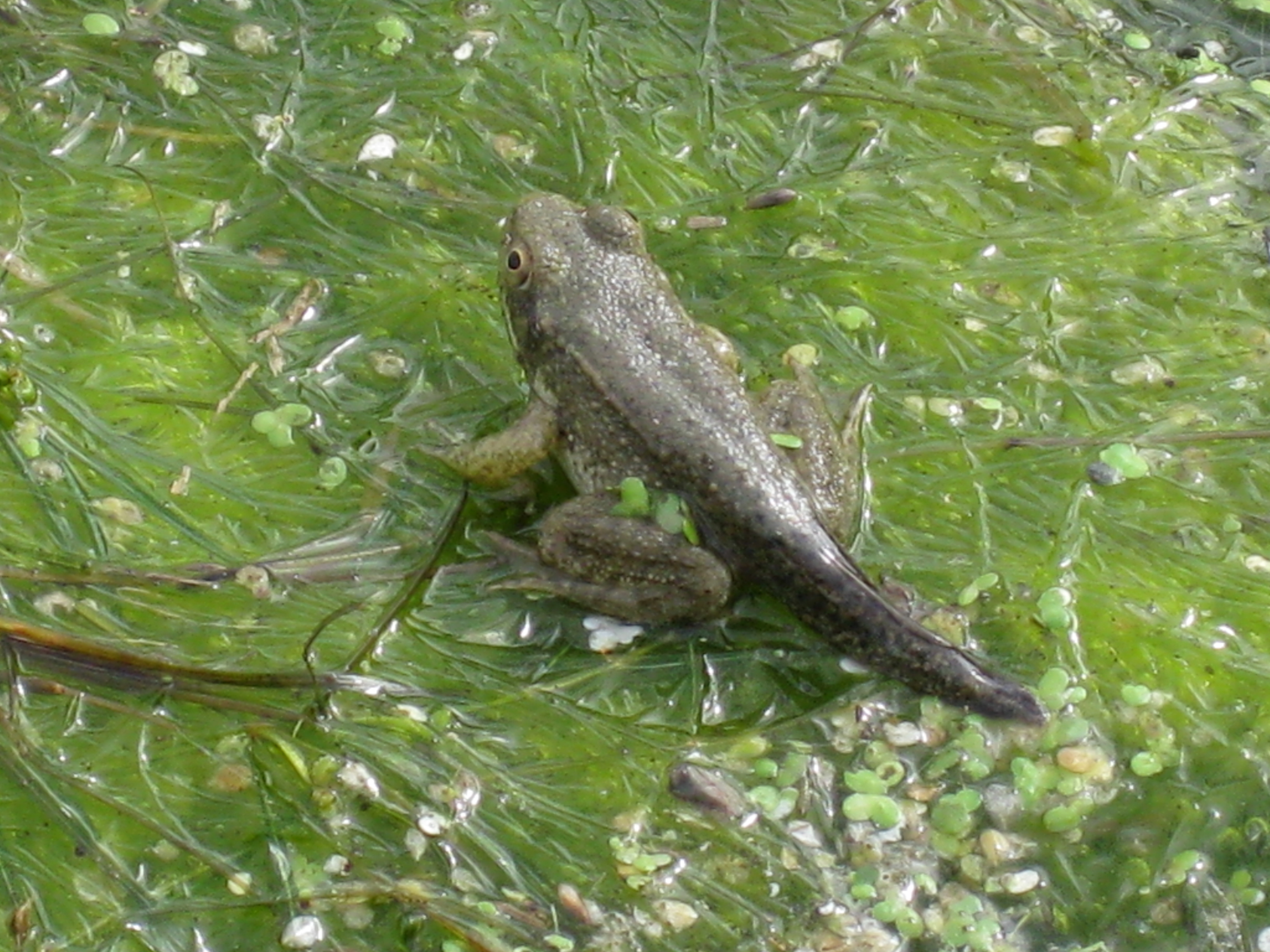 Bullfrog tadpole checking out the scenery above the water. Look at how fast it has developed legs compared with the picture in the May 6th post, “Toads and Frogs, Living and Loving.”