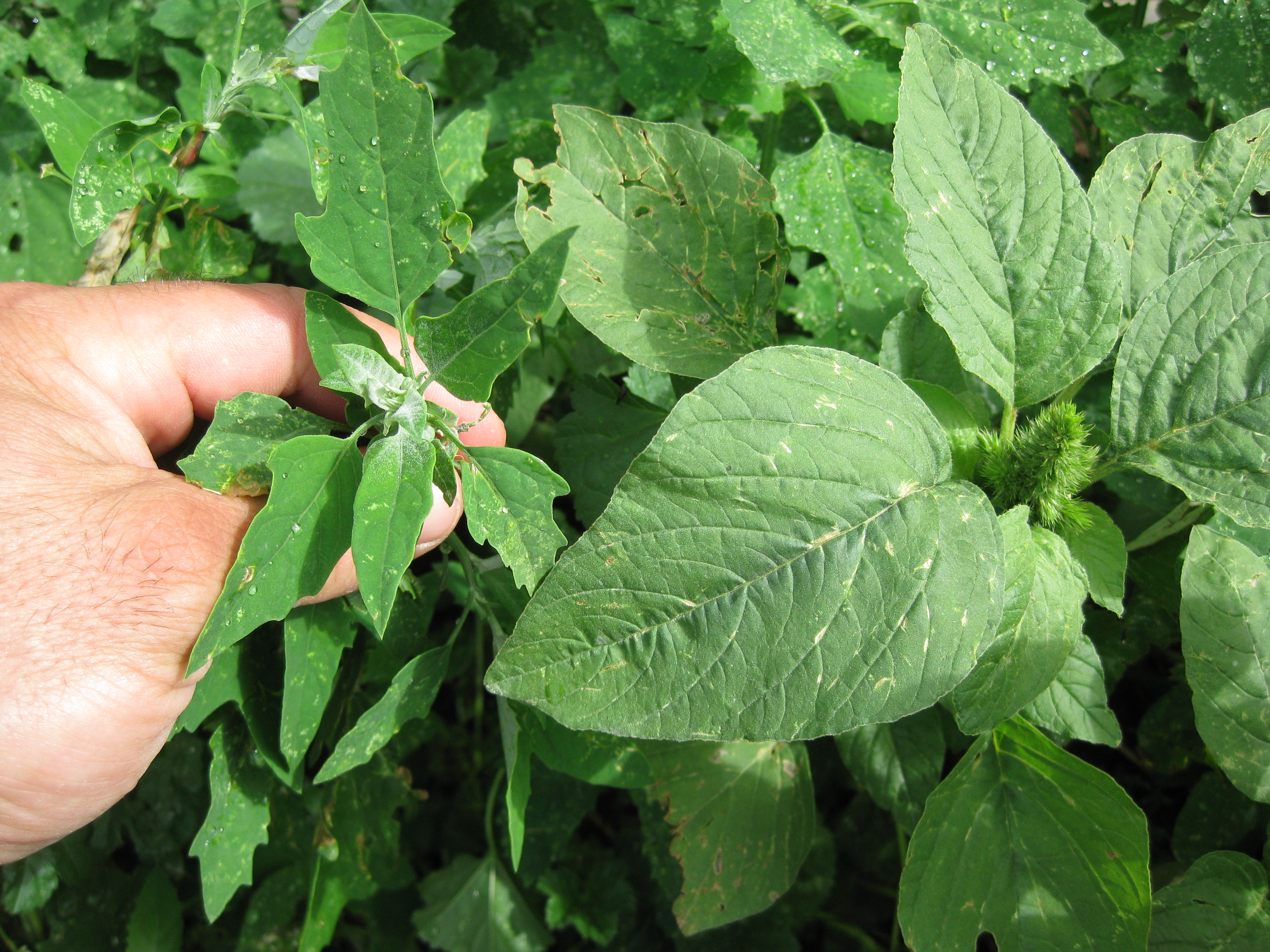 • I call the plant on the left, Chenopodium album, lambsquarter. The plant on the right, Amaranthus retroflexus, I call Pigweed. Yes, both weeds are doing well on my farm as well.