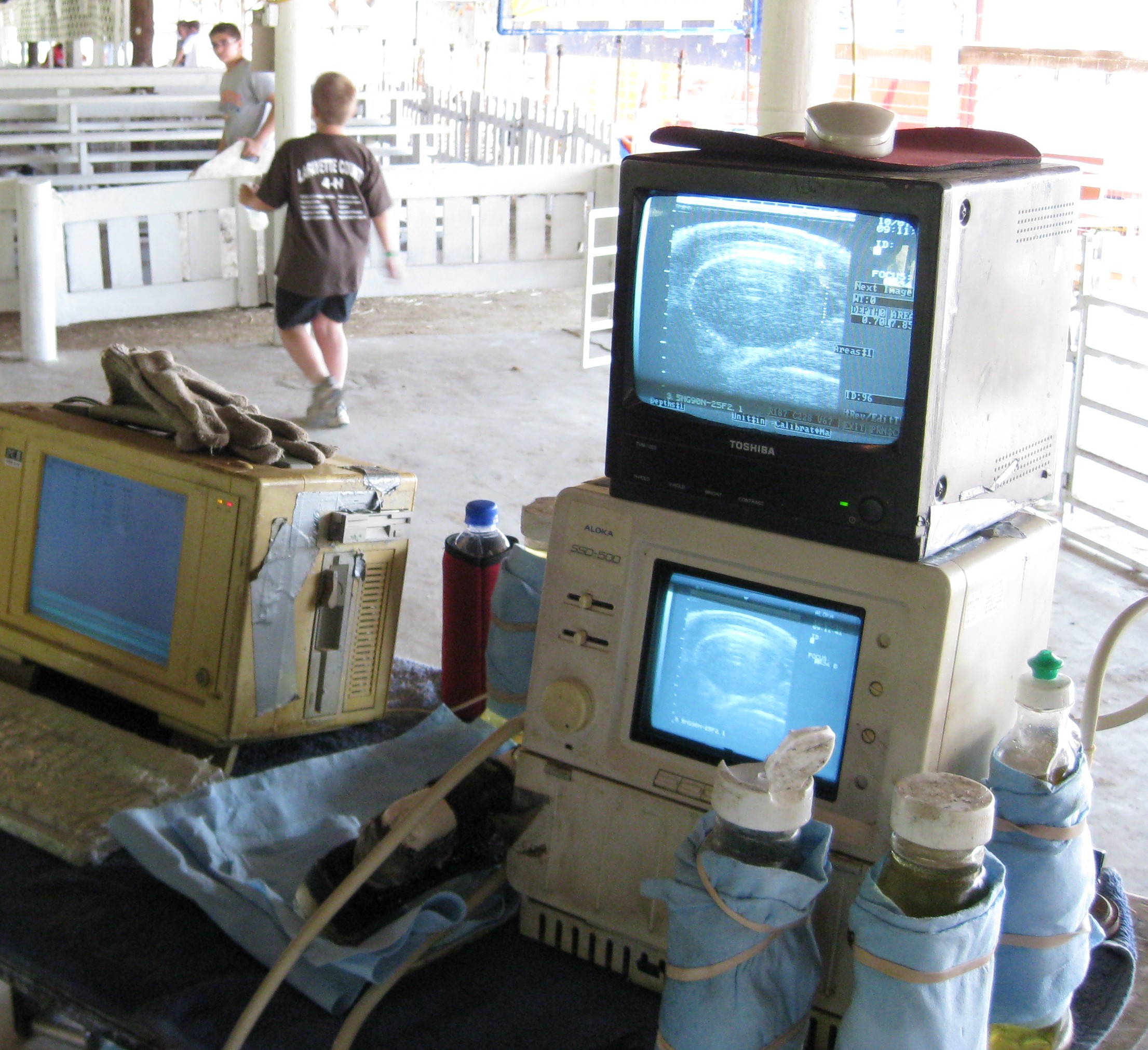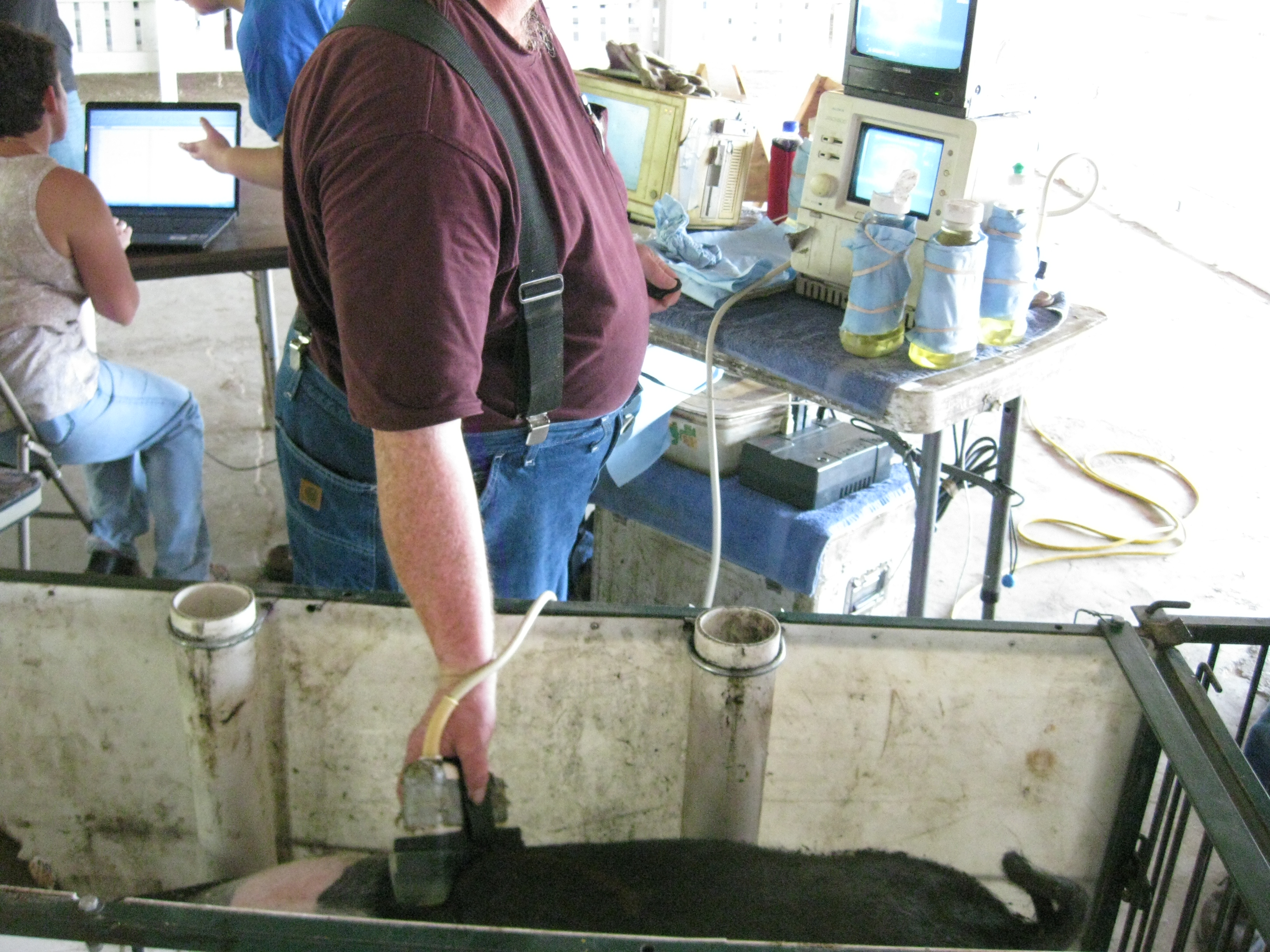 Because of my background as a certified swine ultrasound technician, the fair superintendent asked me to line-up a technician.  Ultrasound is used to evaluate a hog’s carcass.  Below is a picture of the technician with the probe on a hog’s back.  The information is entered into a computer and a formula is used to rank the hogs on percent lean.