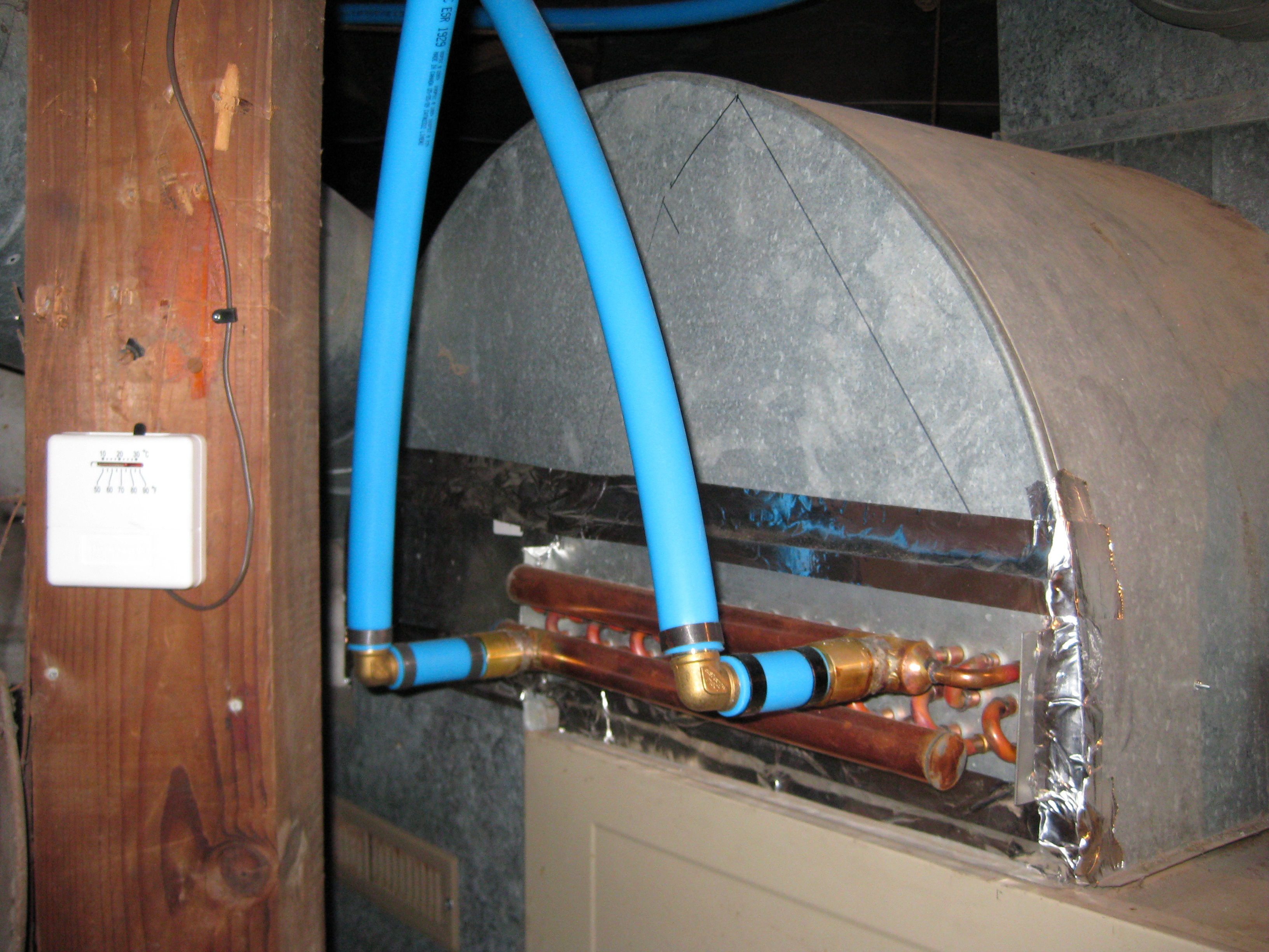 The hot water then travels to a radiator which was placed in the plenum of my original furnace. The fan from the furnace blows air across the radiator when heat is needed.