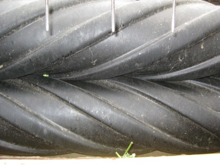 This haybine is called a mower/conditioner.  The conditioning is performed by these two rolls.  The hay is crushed as it passes through the rolls, allowing the stems to lose moisture faster.  This helps with alfalfa, but isn’t necessary for grass.