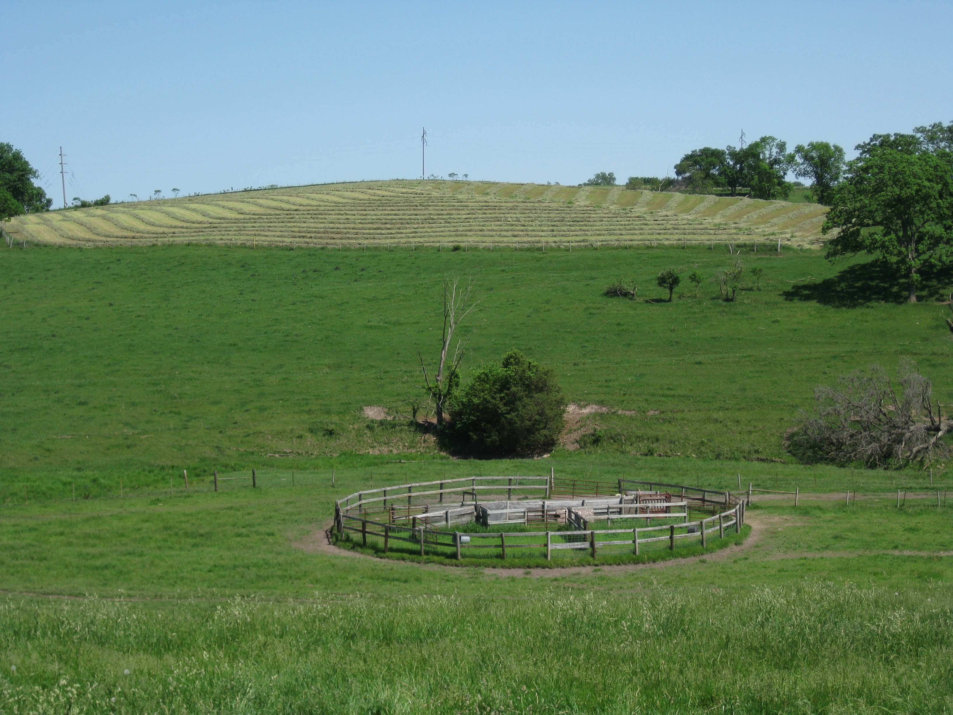 Field of raked hay.  After two to three days of drying, the mowed hay is raked into a double windrow, meaning two are merged into one, resulting in less time baling.  The hay continues to dry as the hay which was underneath is now exposed to the air and sunshine.