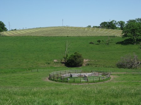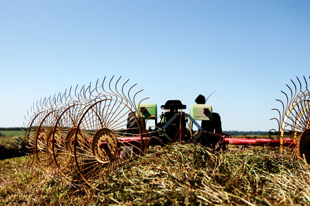 The picture below is of our wheel rake.  Each arm of wheels moves up and down hydraulically.  When the wheels are down, they turn along the ground moving the hay into the center.