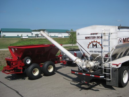 I enjoyed attending a Midwestern Bio-Ag field day. Fertilizer is their main business, but they also deal in feed and seed. Pictured is a large truck which is used to spread fertilizer, and a red buggy which a farmer can pull behind a tractor to spread fertilizer.