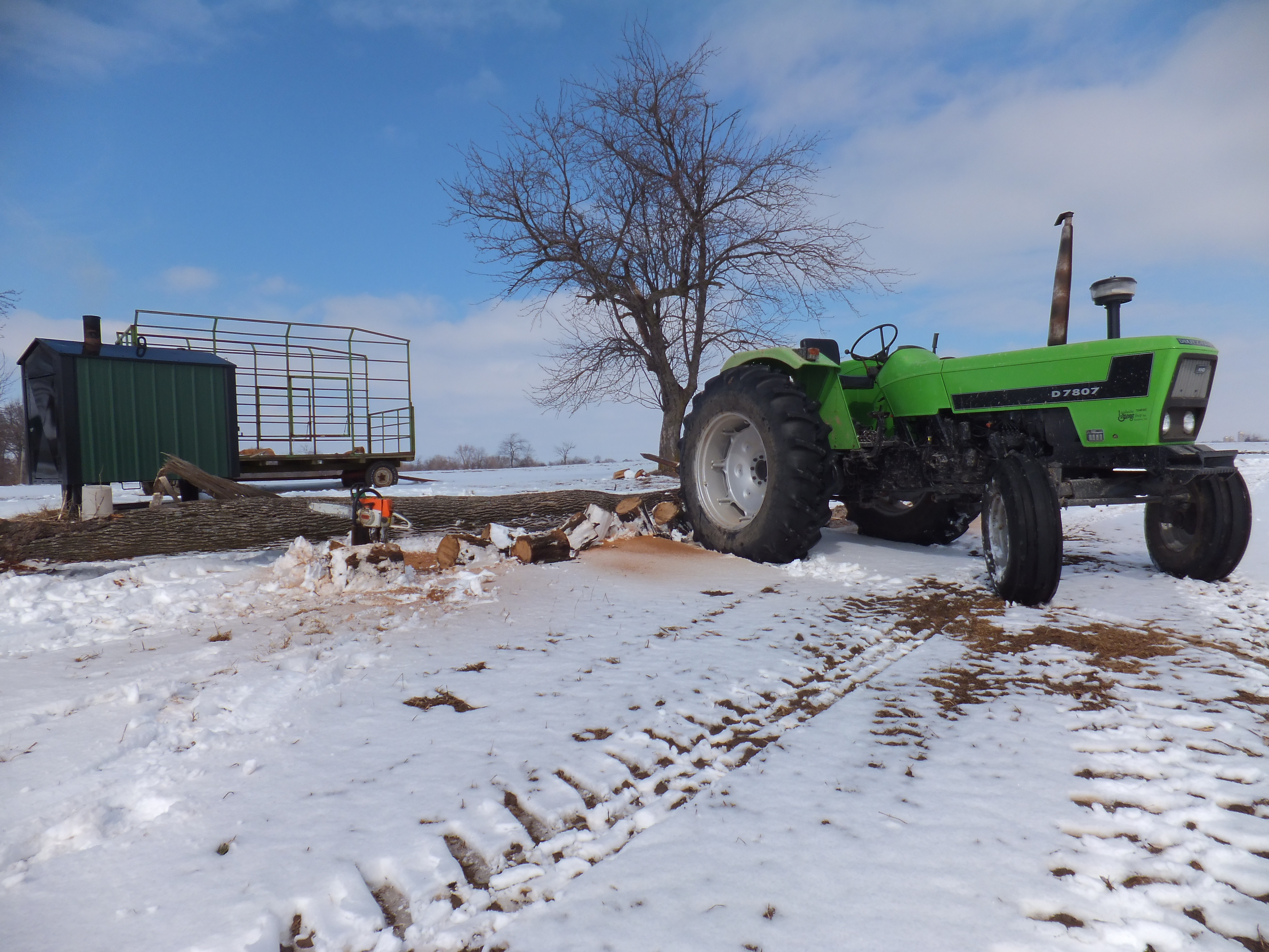 Pictured is my tractor.  I bought it last autumn.  It’s a 1981 Deutz 7807.  It has 78 horsepower, which is just enough for grinding feed, the most demanding horsepower job on my farm.  I bought it from a dealer who sold it new.  It has 4500 hours on it and I paid $8500 for it.  I like it so far.