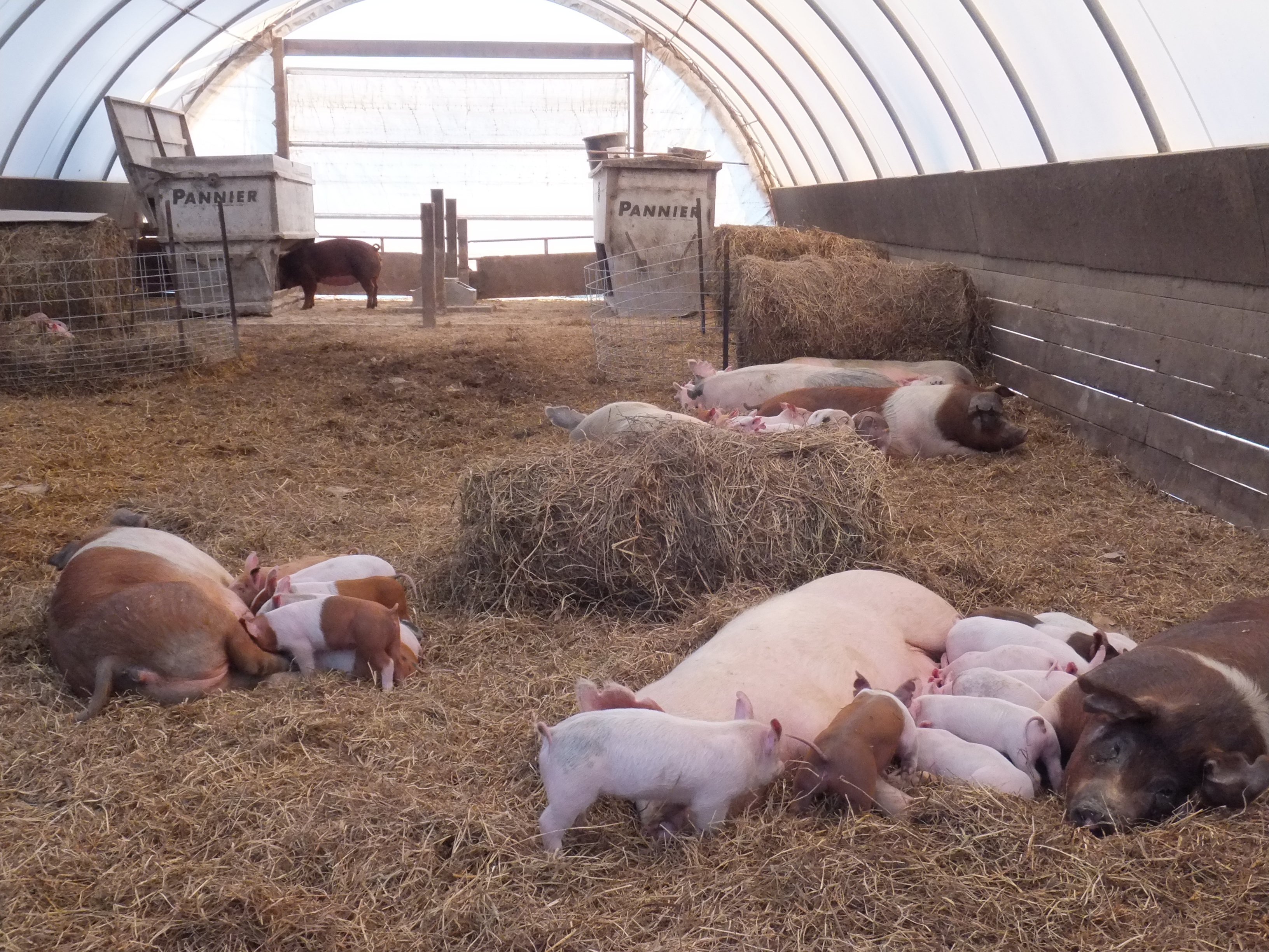 The pens were about nine feet by nine feet. I just purchased ten English style farrowing huts from Port-A-Hut. I fear they may not be large enough, measuring nine feet by 5 and a half feet. Time will tell. The huts will give me more flexibility, allowing me to farrow outside of the hoop barns.