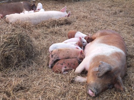 I learned a lot these past two months, and ended up with some live piglets. Nine sows averaged seven piglets weaned per litter. Two sows lost 18 of 20 piglets when they farrowed in below zero F weather. So the total average is just under six piglets weaned per litter.