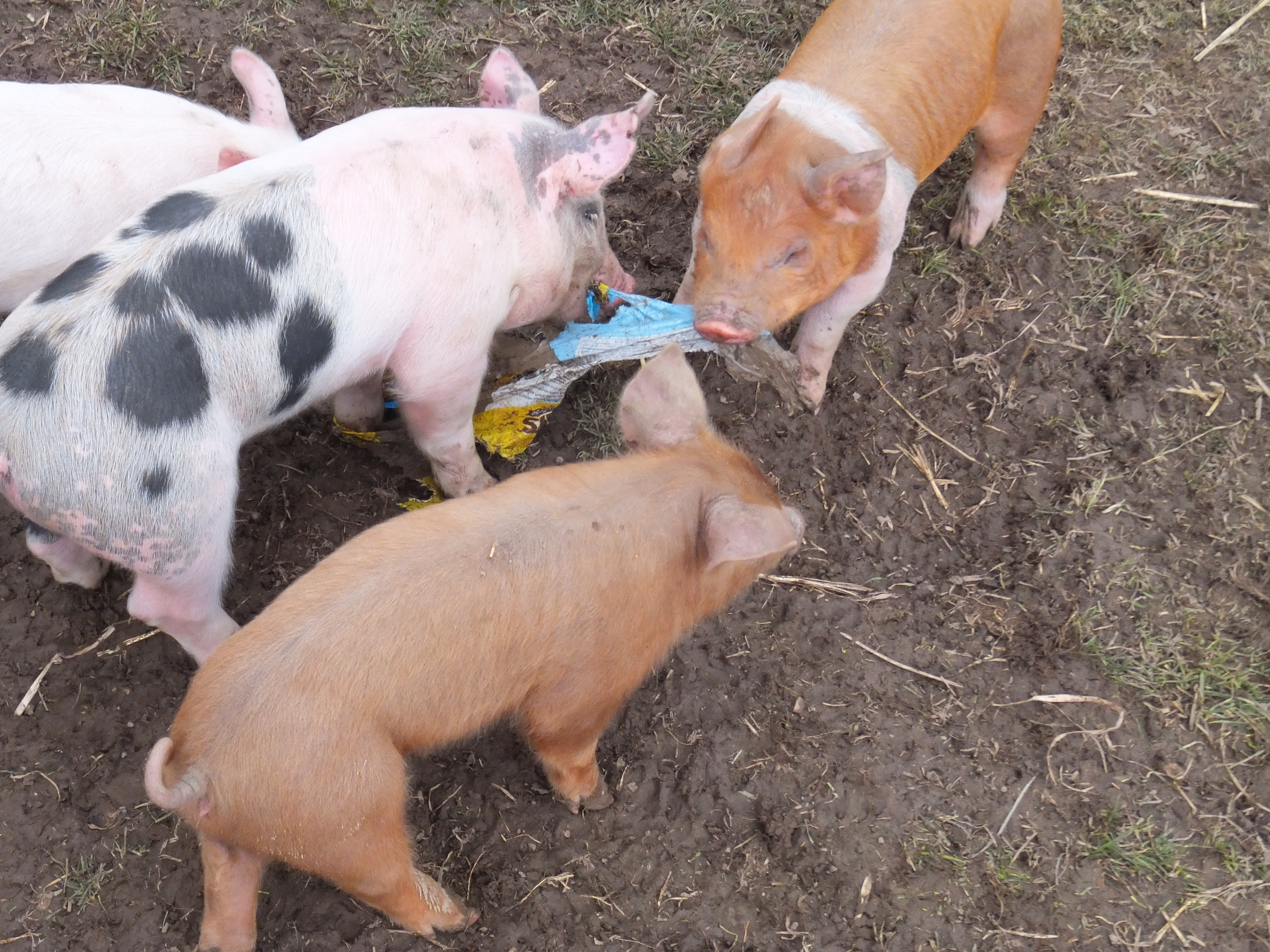The piglet in the top photo has a different personality. She came over to my uncle and worked on his disposable plastic boots until she had tore a hole in one.