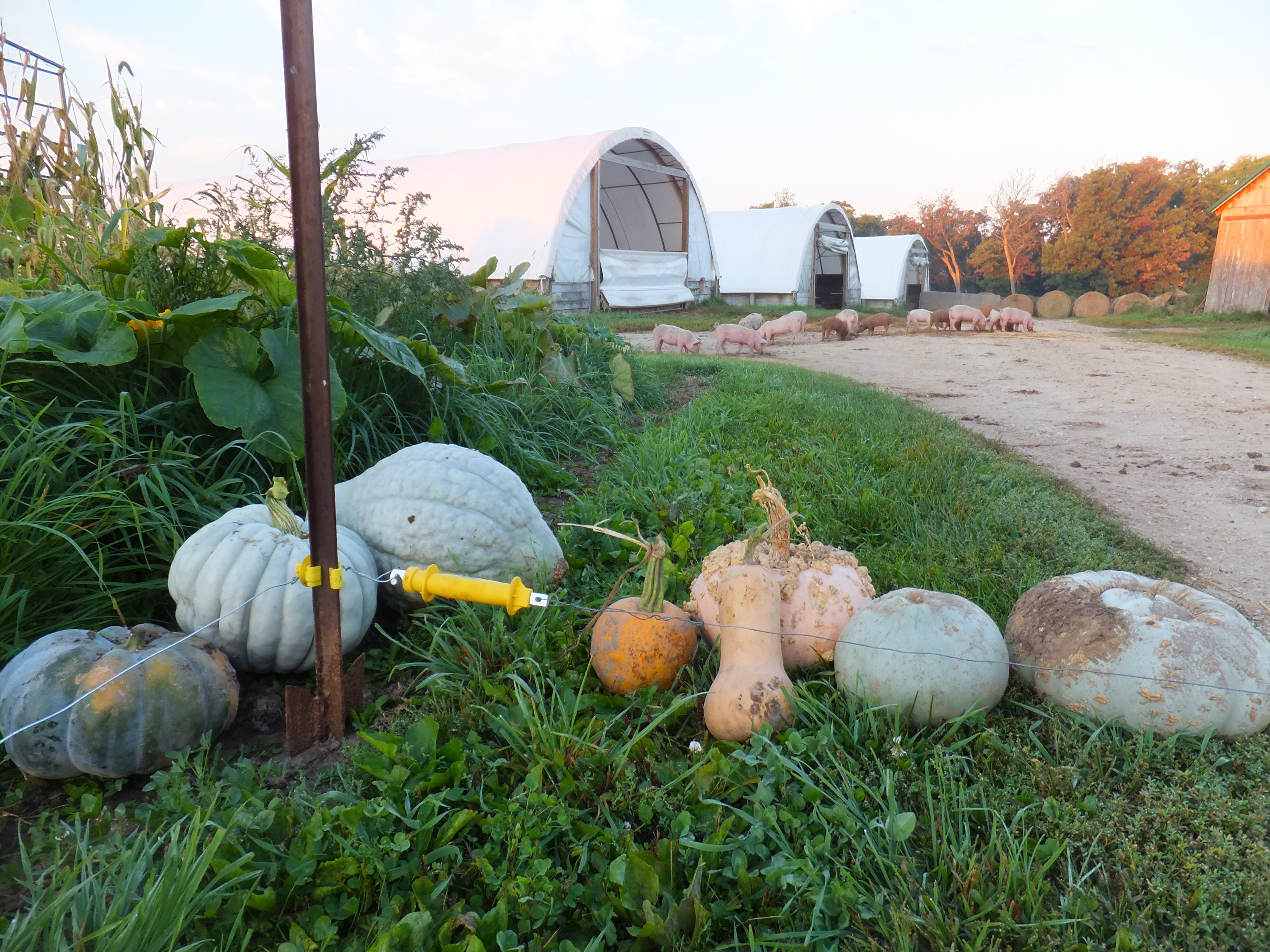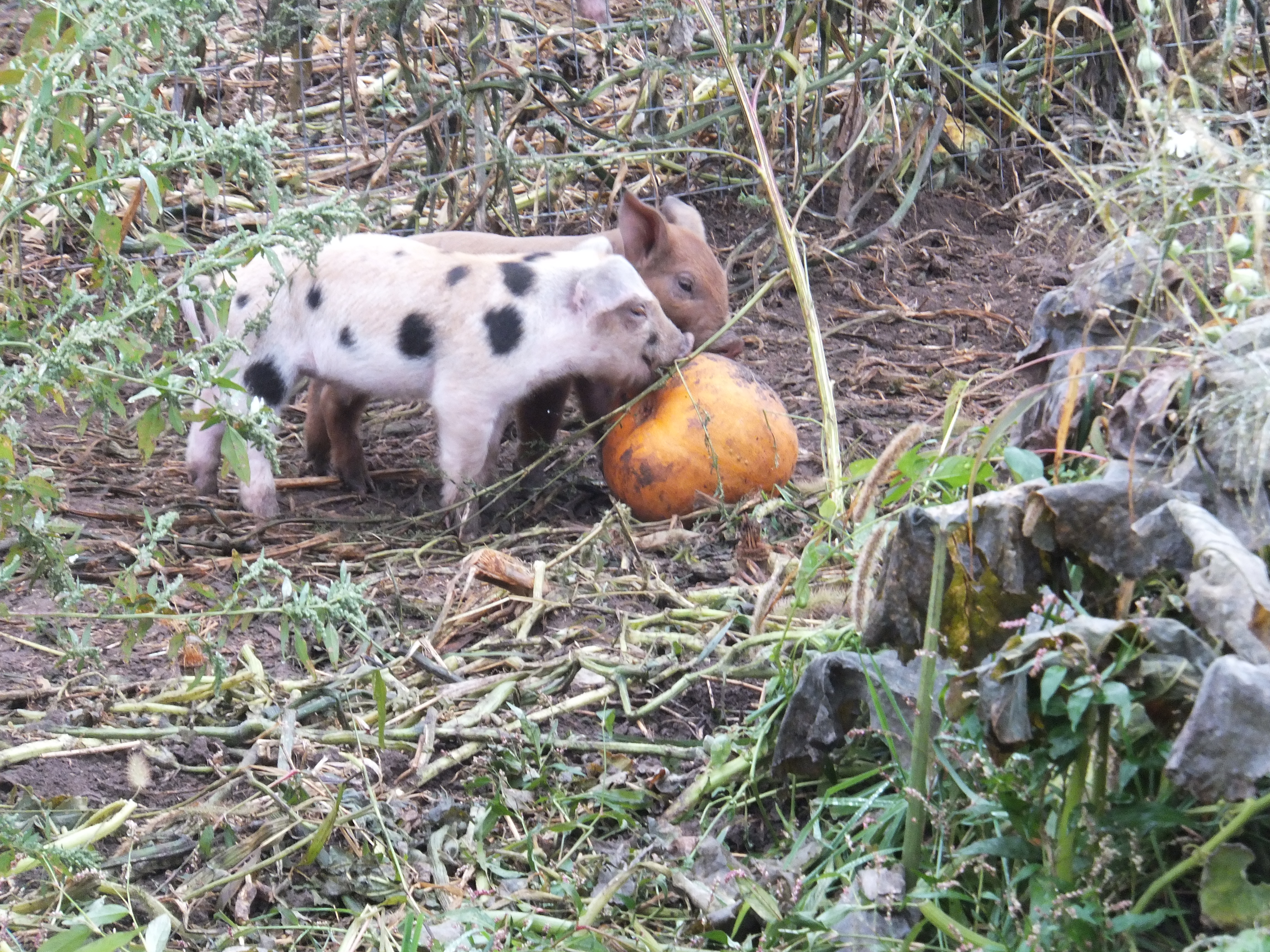 I gave the piglets their own shelter in the sweet corn patch and their own feed and water. They really started eating grain, but continued to nurse and graze and eat other stuff like pumpkins. They were doing very well, with the biggest ones weighing over fifty pounds. They were so big in fact, a litter of ten was unable to all fit around their mom’s udder.