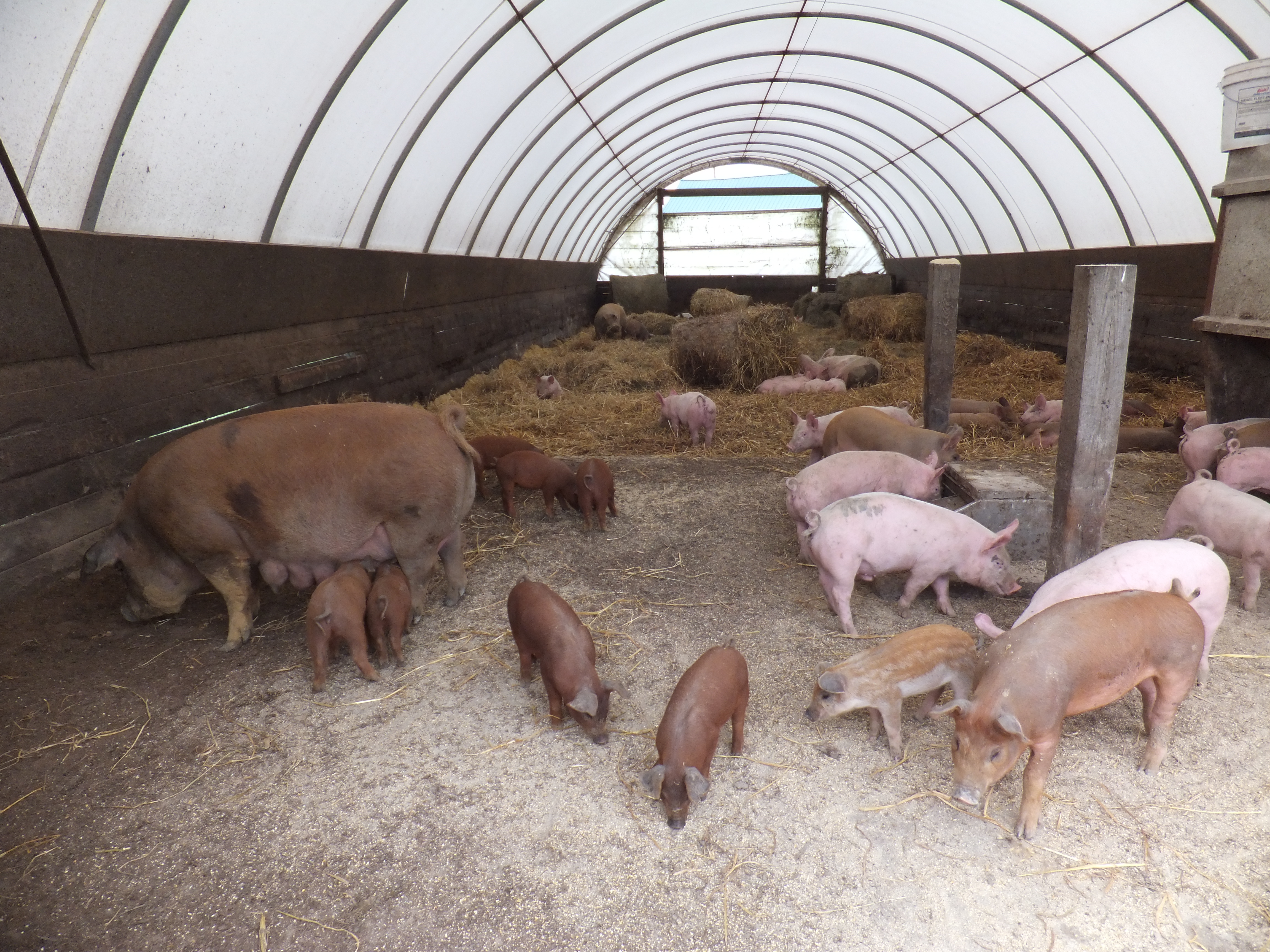 The next morning I shut the gates and all but three piglets were in the hoop building. I caught the three piglets with my hydraulic trailer and then sorted the sows out of the hoop barn and they were weaned. Below you can see a photo of a sow and different ages of piglets in the hoop barn.