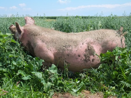 The sows and gilts in these two photos are receiving three pounds of grain each. This is roughly half of what they would need if they had no access to forage, and only a quarter of what they would eat if they were on full feed of grain. So these hogs take grazing seriously and don’t spend much time rooting except for in their wallow.