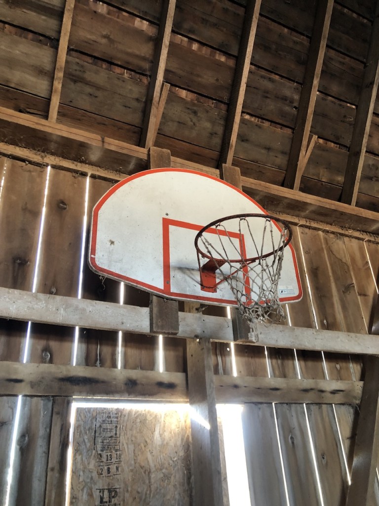 A wooden backboard with metal rim mounted on the inside wall of the barn with six sheets of plywood screwed to the floor to make a good surface to dribble on. I received a basketball under the tree and then was told to go to the barn to do chores. There I discovered my court.