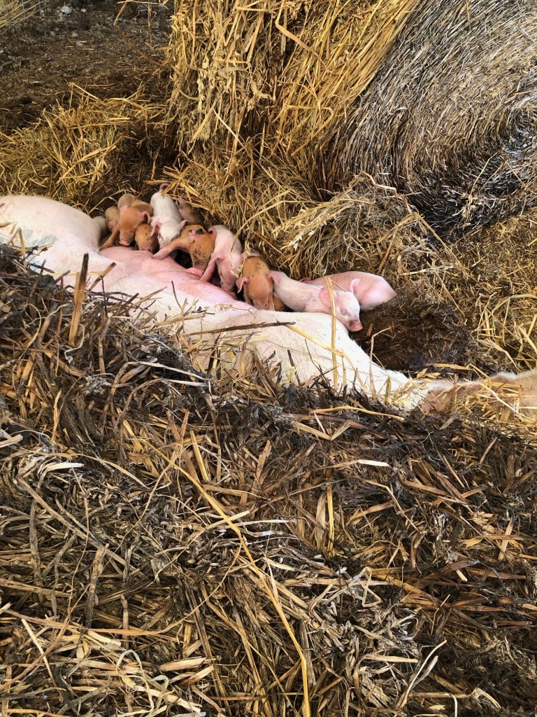 Our fall litters are off to a good start. The white sow farrowed 15 and still has 14 live, snug in the straw.
