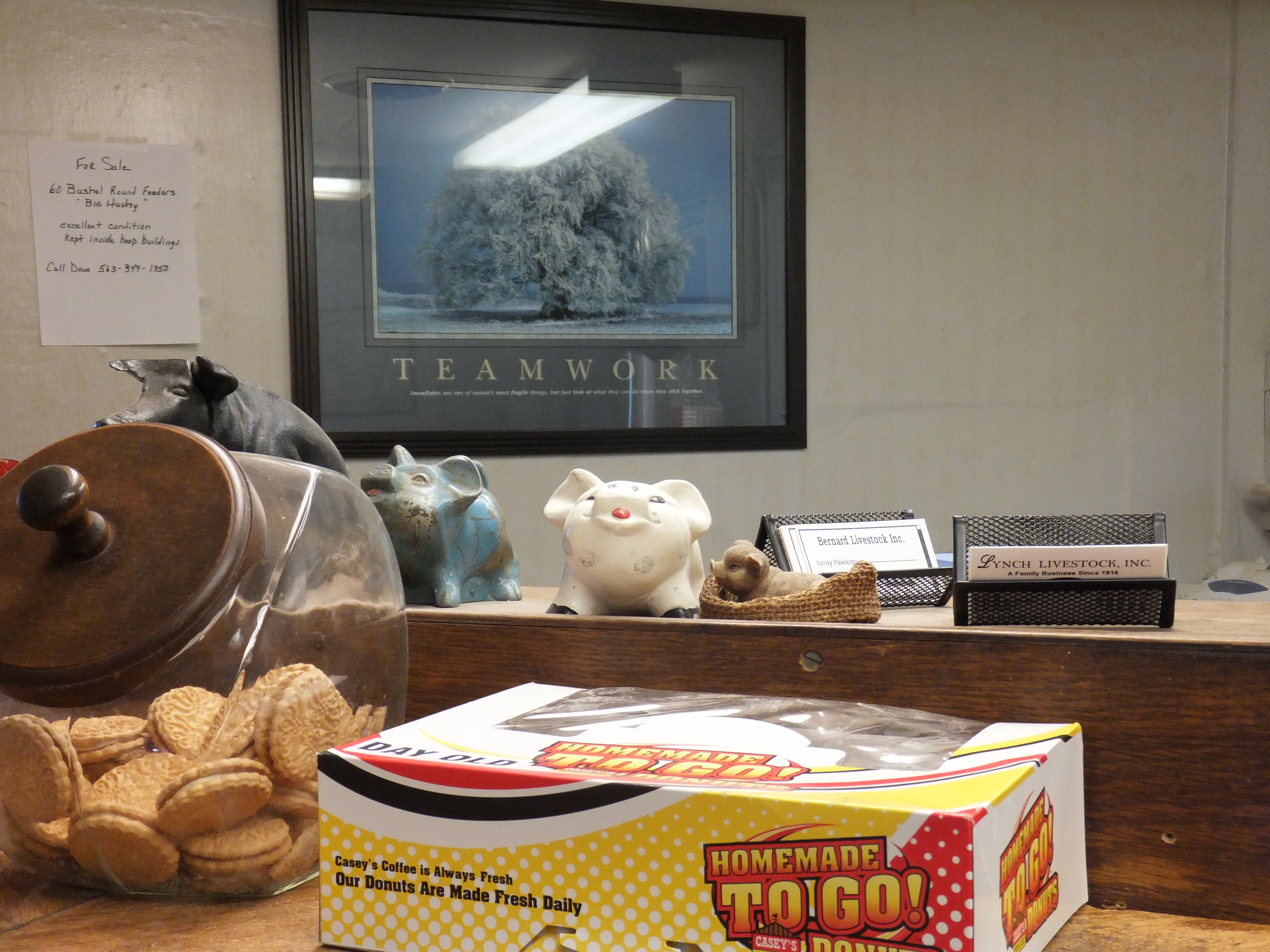 The office of Lynch Livestock, Iowa.  We sold cull sows last week.  Leroy always treats us well, but I was shocked with our price.  He paid $.61 per pound for the heaviest sows weighing over 600 pounds.  It was about $370 per sow.  I can remember when I was pleased with $200 per sow.