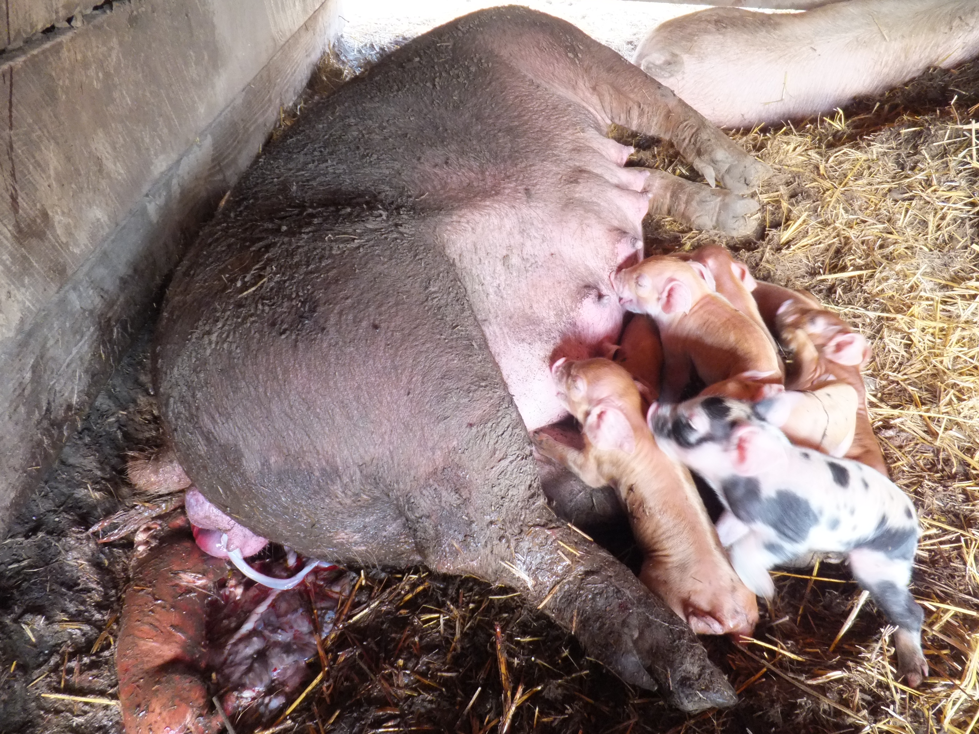 Except for one very big Landrace sow who chose to carry way too much bedding into her hut and farrowed on a very cold night.  All her piglets died.  My theory is whereas the other sows made a nest with at least a little room for the piglets to nurse, see photo below, this sow was so big with so much bedding, the piglets were simply unable to start nursing due to lack of room.