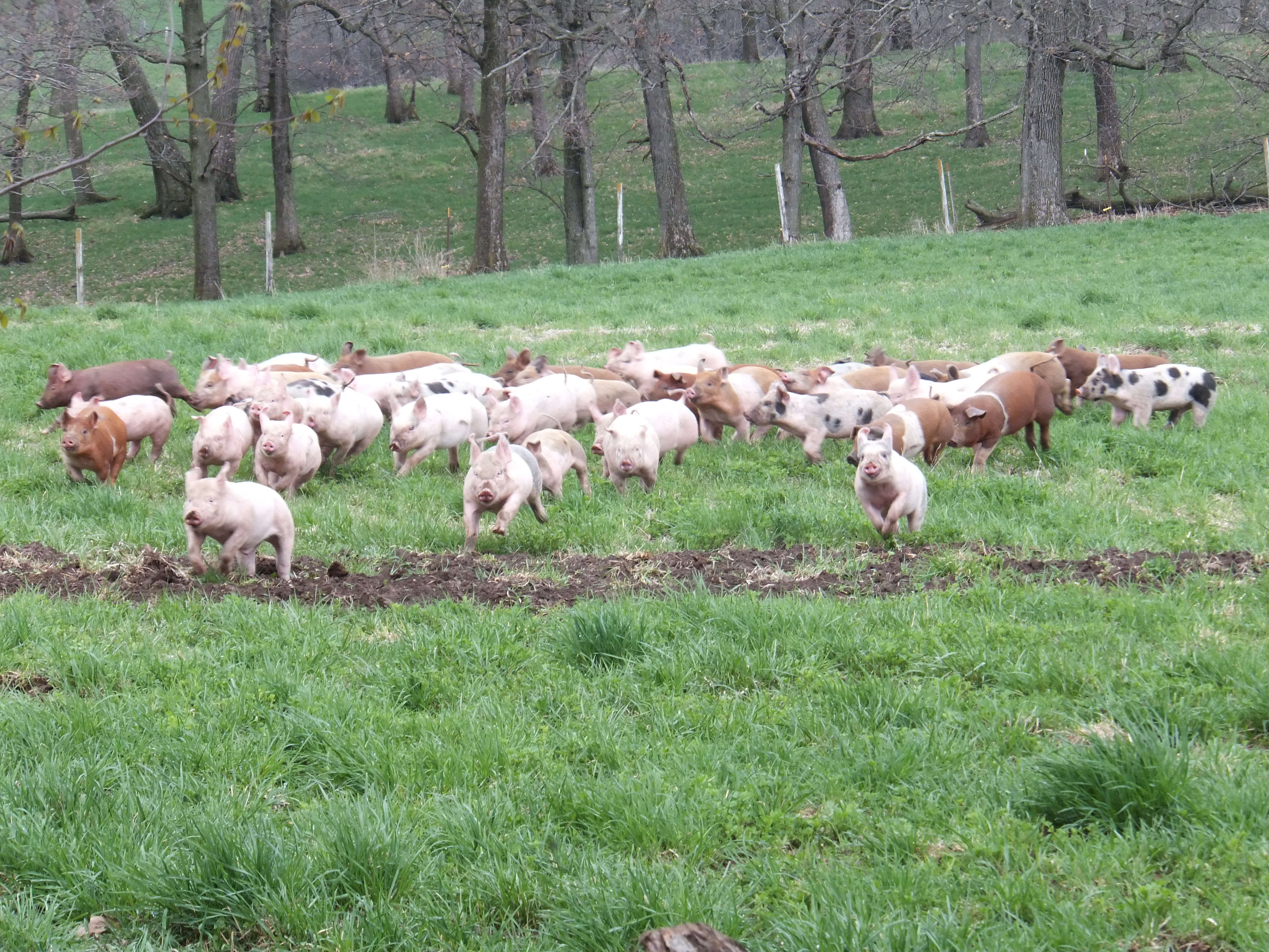A plan was born to trade apple trees for meat, we just had to wait until spring. Well that time came last Sunday as you can see by the photos. 16 apple trees planted next to our pig pasture.