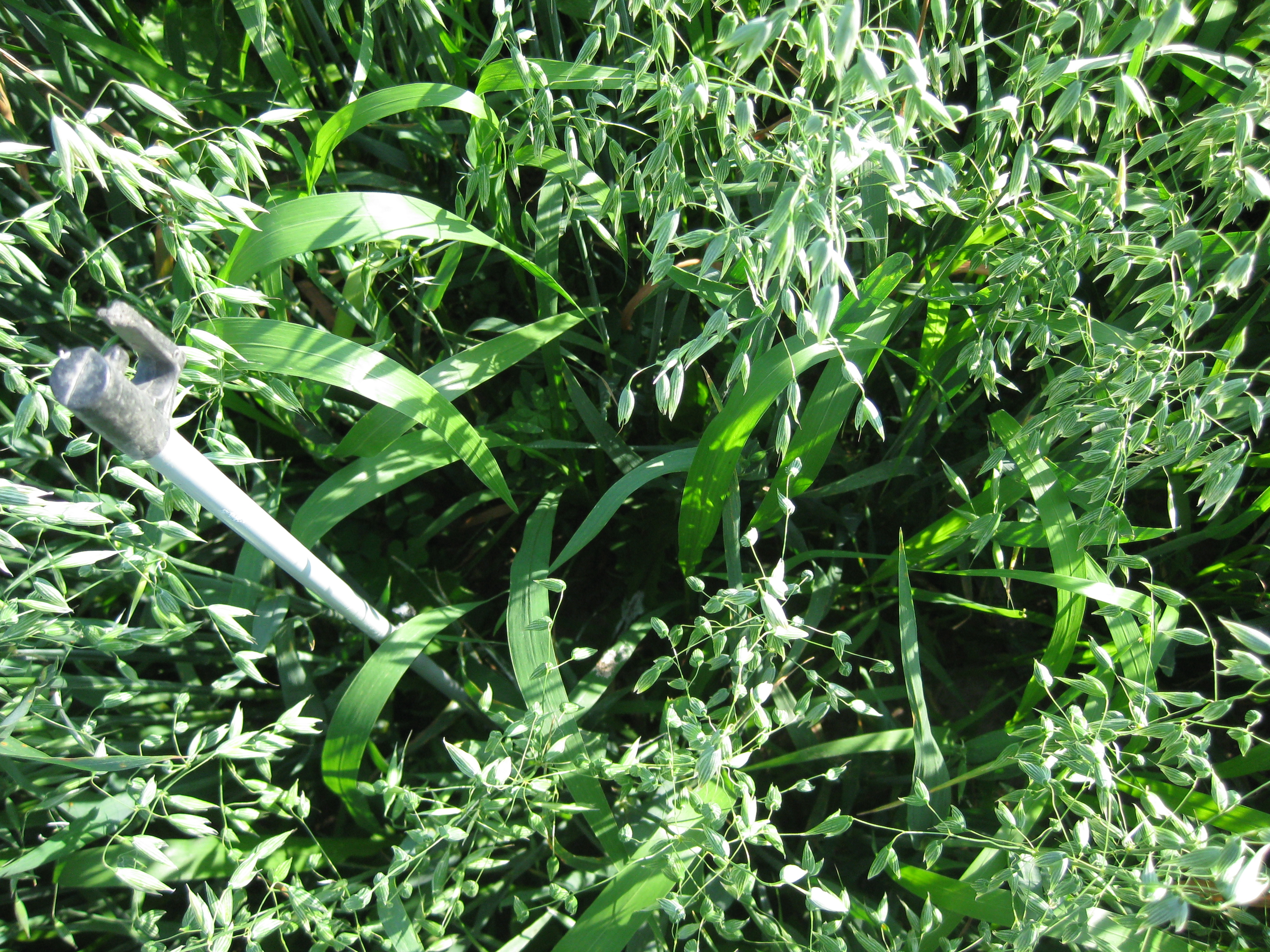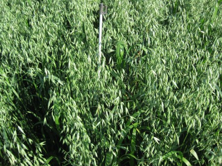 July 16, 2011I cut the oats with the haybine yesterday. A severe storm blew in Monday morning and flattened the field, pictured below. It flattened the corn as well, but the corn is straightening itself back up. The oats won’t come back up this late in their life cycle, so they would be close to impossible to combine, (removing the grain from the straw). We’ll bale the whole plant instead, and feed it as a forage.