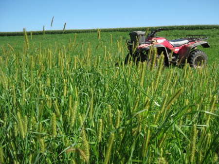 Giant Foxtail is an invasive weed from Asia that we have entirely too much of on our farm. It prefers high ph soils that have been compacted. Our soil, mere feet above a limestone base, is consistently neutral to alkaline. This picture was taken where the cows compacted the soil, last march.